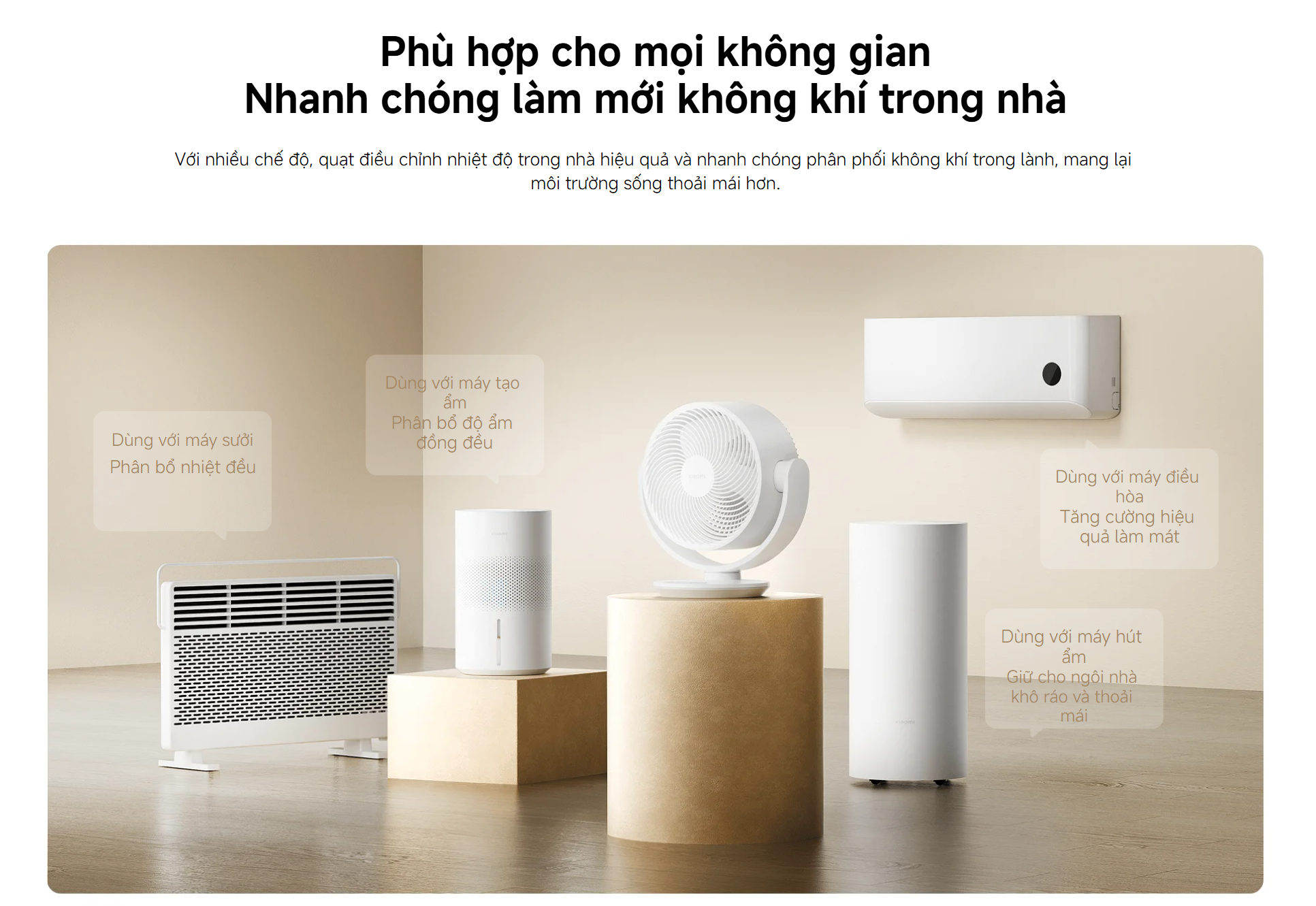 Quạt tuần hoàn để bàn Xiaomi không chỉ làm mát mà còn hỗ trợ tối ưu hiệu quả của các thiết bị khác. Khi dùng cùng điều hòa, không khí lạnh được phân bổ đều hơn. Khi kết hợp với máy tạo ẩm hoặc máy sưởi, môi trường trong phòng được cân bằng tốt hơn về nhiệt độ và độ ẩm. Khi dùng với máy hút ẩm, không gian trở nên khô ráo và dễ chịu hơn.