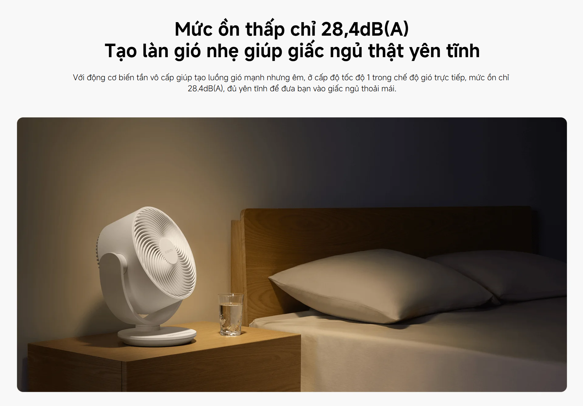 Quạt hoạt động với độ ồn thấp chỉ khoảng 28.4dB, mang lại không gian yên tĩnh lý tưởng cho giấc ngủ. Động cơ DC biến tần giúp duy trì luồng gió ổn định, không gây tiếng ồn khó chịu ngay cả khi hoạt động trong thời gian dài.