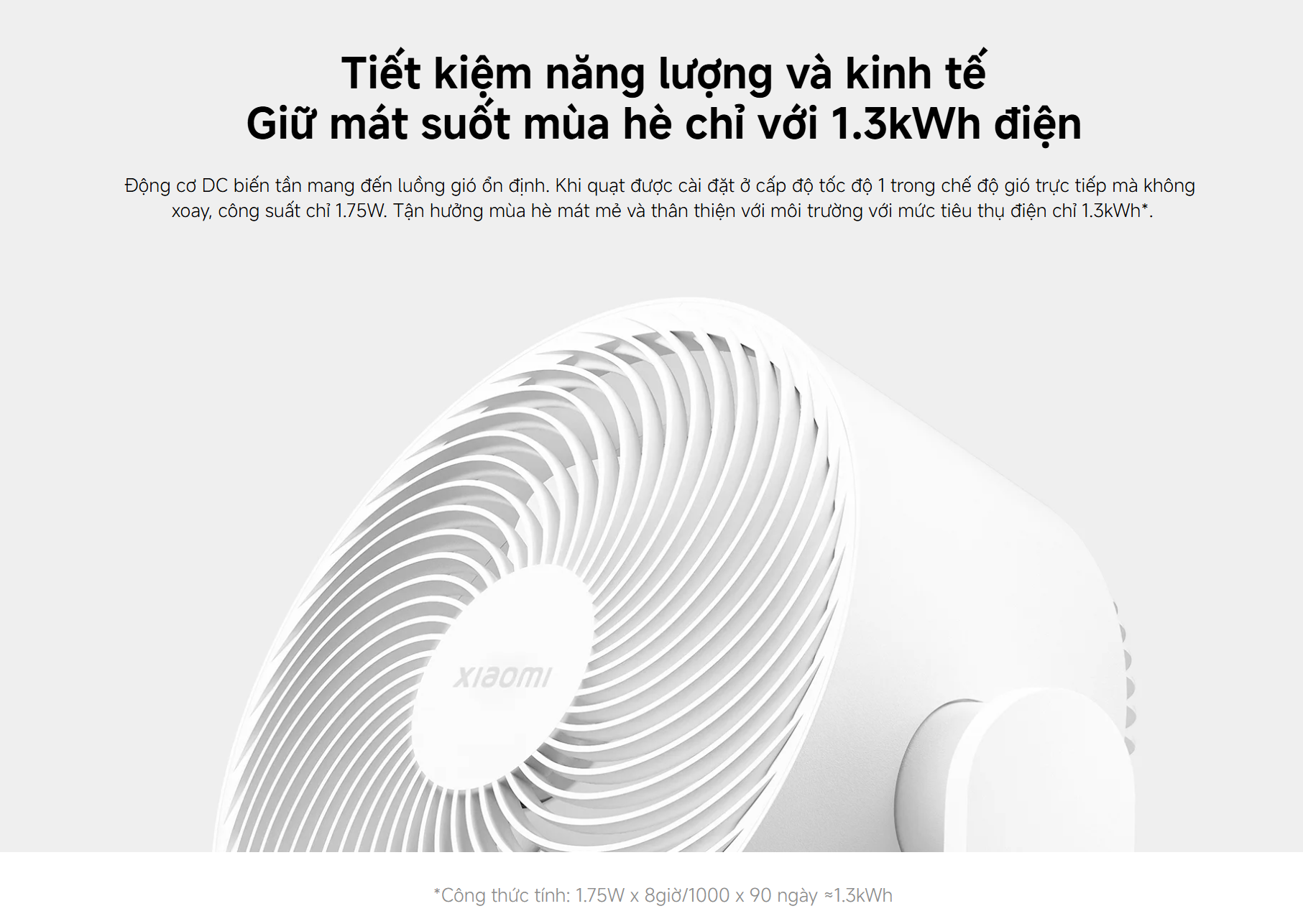 Nhờ động cơ inverter hiện đại, quạt tiêu thụ điện năng cực thấp. Khi hoạt động ở mức gió thấp, công suất chỉ khoảng 1.75W. Tổng điện năng tiêu thụ trong suốt mùa hè chỉ khoảng 1.3kWh, giúp tiết kiệm chi phí điện tối đa và thân thiện với môi trường.