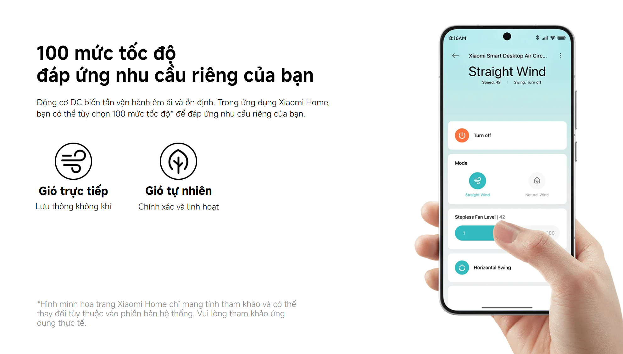 Thông qua ứng dụng Xiaomi Home, người dùng có thể tùy chỉnh đến 100 mức tốc độ gió khác nhau. Quạt hỗ trợ hai chế độ gồm gió trực tiếp giúp làm mát nhanh và gió tự nhiên mang lại cảm giác nhẹ nhàng, linh hoạt hơn. Việc điều khiển từ xa và cài đặt lịch hoạt động giúp tối ưu trải nghiệm sử dụng.