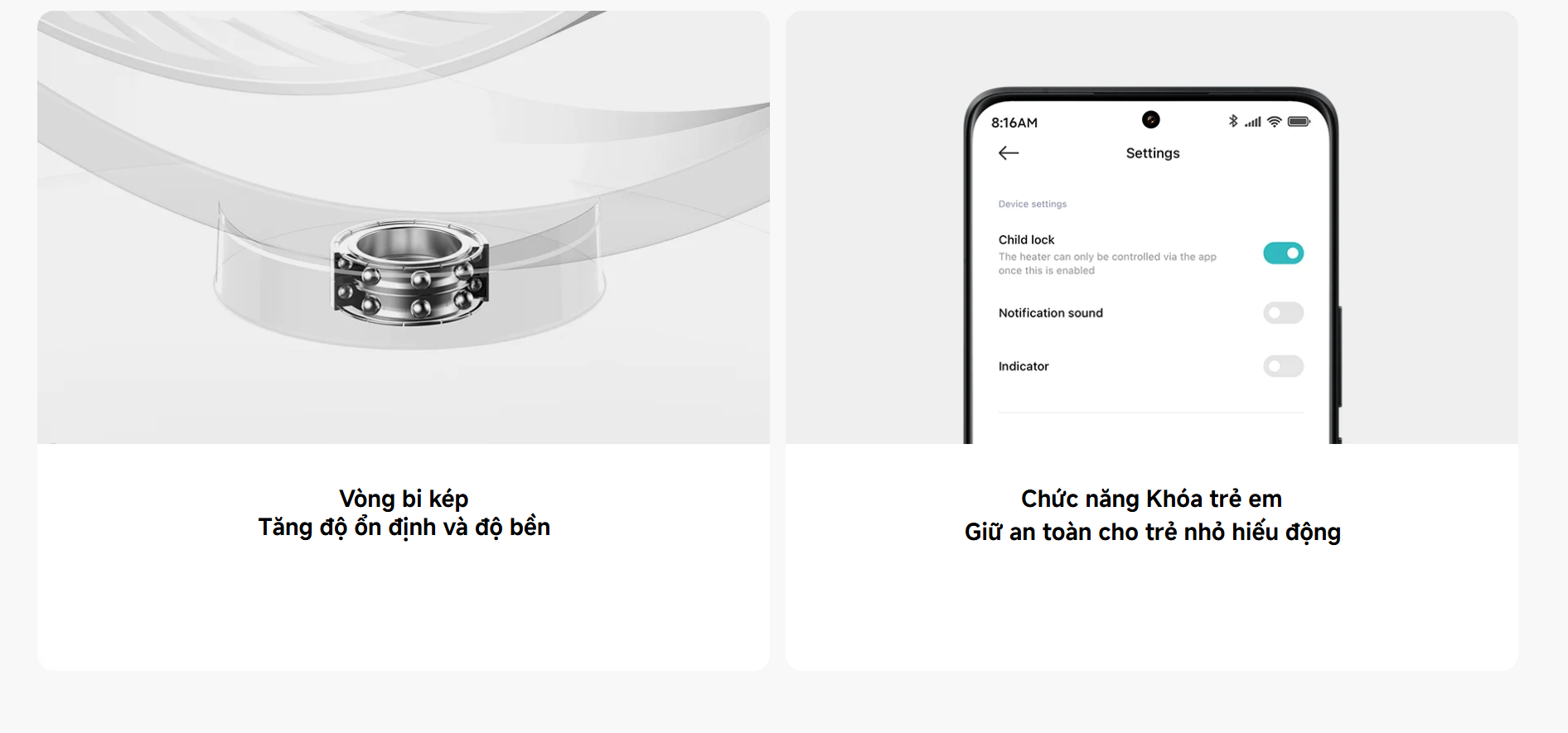 Sản phẩm được trang bị các chi tiết tiện lợi như bộ phận tháo rời giúp vệ sinh dễ dàng, vòng bi kép tăng độ bền và độ ổn định, cùng chức năng khóa trẻ em đảm bảo an toàn trong quá trình sử dụng.