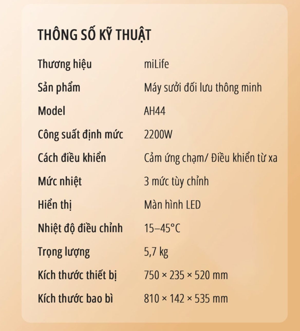 Với công suất 2200W, máy sưởi miLife AH44 cho khả năng làm ấm nhanh chóng trong không gian 12–25m². Người dùng có thể điều chỉnh nhiệt độ lên đến 45°C, phù hợp cho nhiều điều kiện thời tiết khác nhau.
