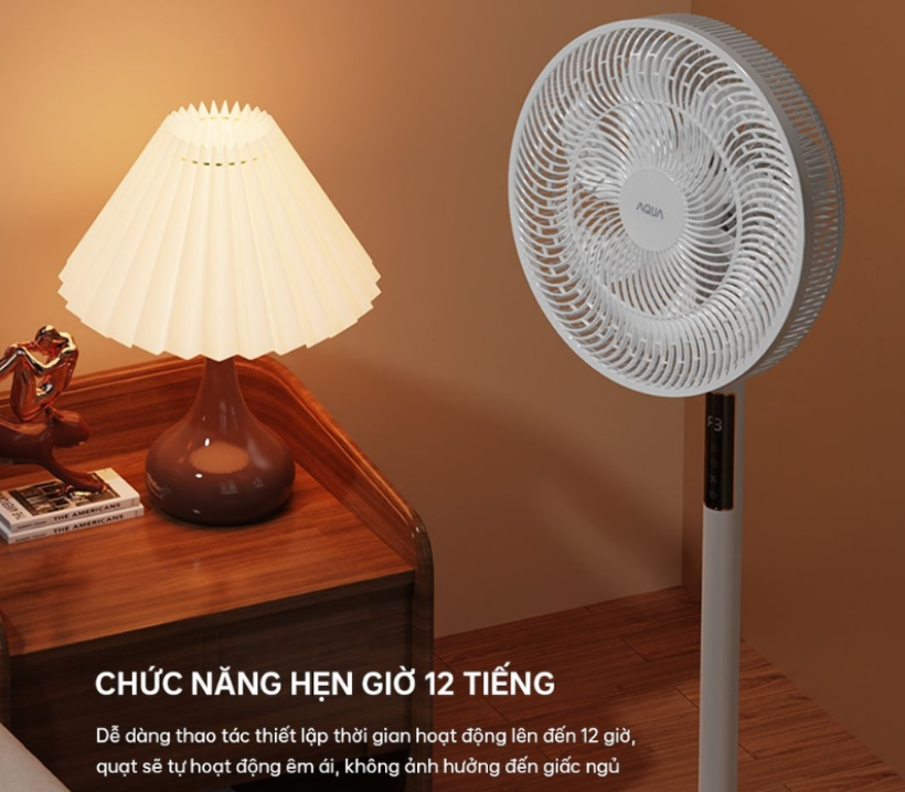 Bạn có thể thiết lập thời gian quạt hoạt động lên đến 12 giờ đồng hồ. Thiết bị sẽ tự động vận hành êm ái và ngắt nguồn đúng theo thời gian đã cài đặt. Tính năng này giúp bạn ngủ ngon giấc trọn đêm, đồng thời hạn chế lãng phí điện năng khi không có nhu cầu sử dụng.
