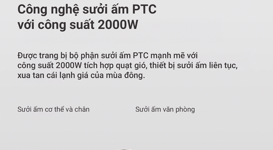 Được trang bị công nghệ sưởi ấm PTC tiên tiến với công suất mạnh mẽ 2000W tích hợp quạt gió, Lumias H08B làm nóng nhanh, sưởi ấm liên tục xua tan cái lạnh giá của mùa đông. Khi nhiệt độ đạt đến mức cài đặt, lõi sưởi sẽ tự động điều chỉnh công suất, duy trì nhiệt độ ổn định và tiết kiệm điện năng. Khác với các loại máy sưởi truyền thống, máy sưởi Lumias H08B không gây khô da, không đốt cháy oxy và không tạo ra tiếng ồn khi hoạt động.
