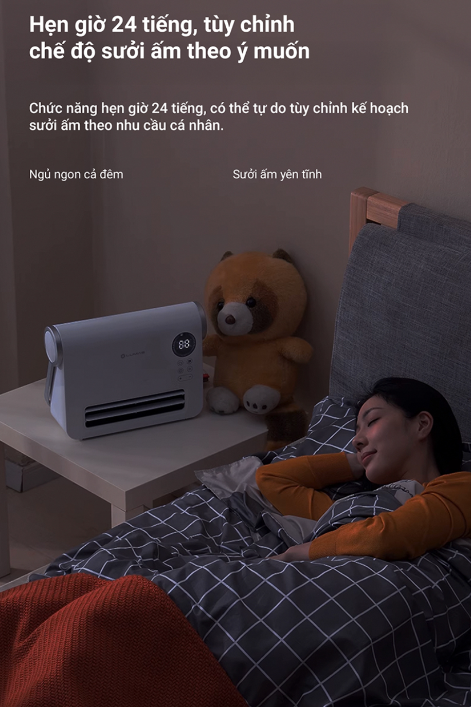 Thiết bị được tích hợp thêm tính năng lên lịch và tùy chỉnh hệ thống sưởi lên đến 24 giờ, có thể cài đặt thời gian hoạt động của máy theo thói quen sinh hoạt của mình, ấm áp khi cần thiết mà không tốn quá nhiều điện năng, giúp tiết kiệm năng lượng, mang đến sự thoải mái và an tâm, hữu ích vào những buổi sáng lạnh lẽo hoặc khi bạn trở về sau một ngày làm việc.