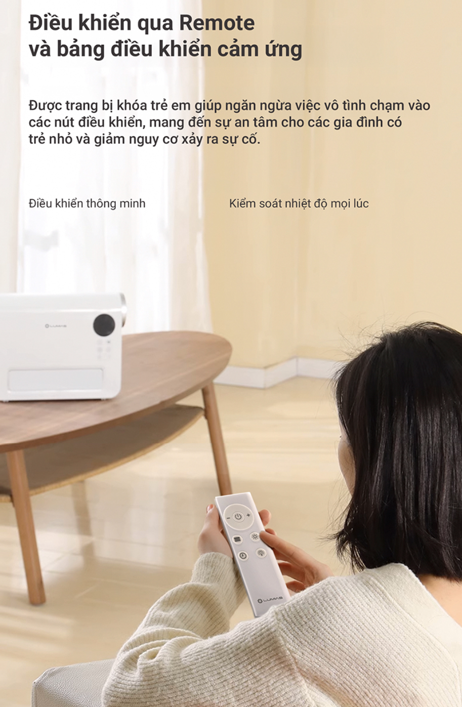 Máy sưởi Lumias H08B đi kèm bảng điều khiển cảm ứng siêu nhạy và điều khiển từ xa tiện lợi qua Remote, giúp bạn dễ dàng điều chỉnh các chế độ hoạt động mà không cần phải đến gần máy. Tính năng này mang lại sự tiện ích tối đa, cho phép bạn kiểm soát nhiệt độ mọi lúc, hẹn giờ hoặc tắt/mở máy.