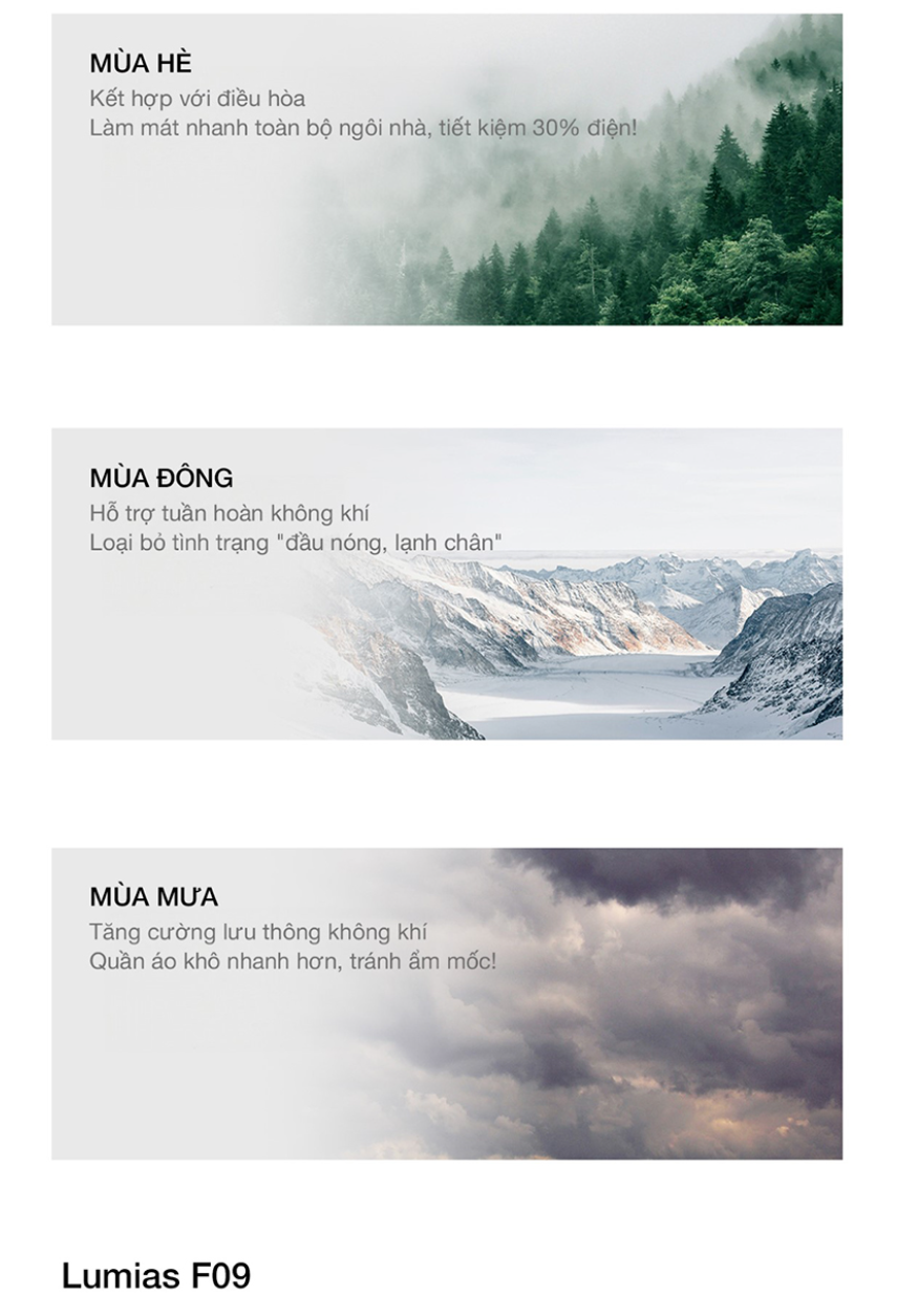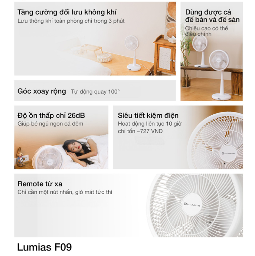 • Khi sử dụng cùng điều hòa, Lumias F09 sẽ tăng cường hiệu quả làm mát, giúp luồng khí lạnh phân bổ đều khắp phòng, từ đó bạn có thể tiết kiệm điện năng đáng kể.