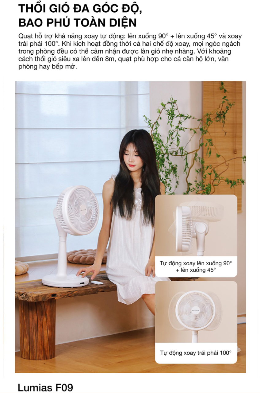 Với khả năng thổi gió đa góc độ và bao phủ toàn diện, quạt điện F09 đảm bảo mọi ngóc ngách trong phòng đều mát mẻ. Quạt hỗ trợ tính năng xoay tự động linh hoạt lên xuống 90° kết hợp lên xuống 45°, cùng với xoay trái phải 100°. Đặc biệt, khi bạn kích hoạt đồng thời cả 2 chế độ xoay này, làn gió nhẹ nhàng sẽ lan tỏa khắp căn phòng. Với khoảng cách thổi gió siêu xa lên đến 8m, quạt Lumias F09 là lựa chọn lý tưởng cho các không gian rộng như căn hộ lớn, văn phòng làm việc hay khu vực bếp mở.