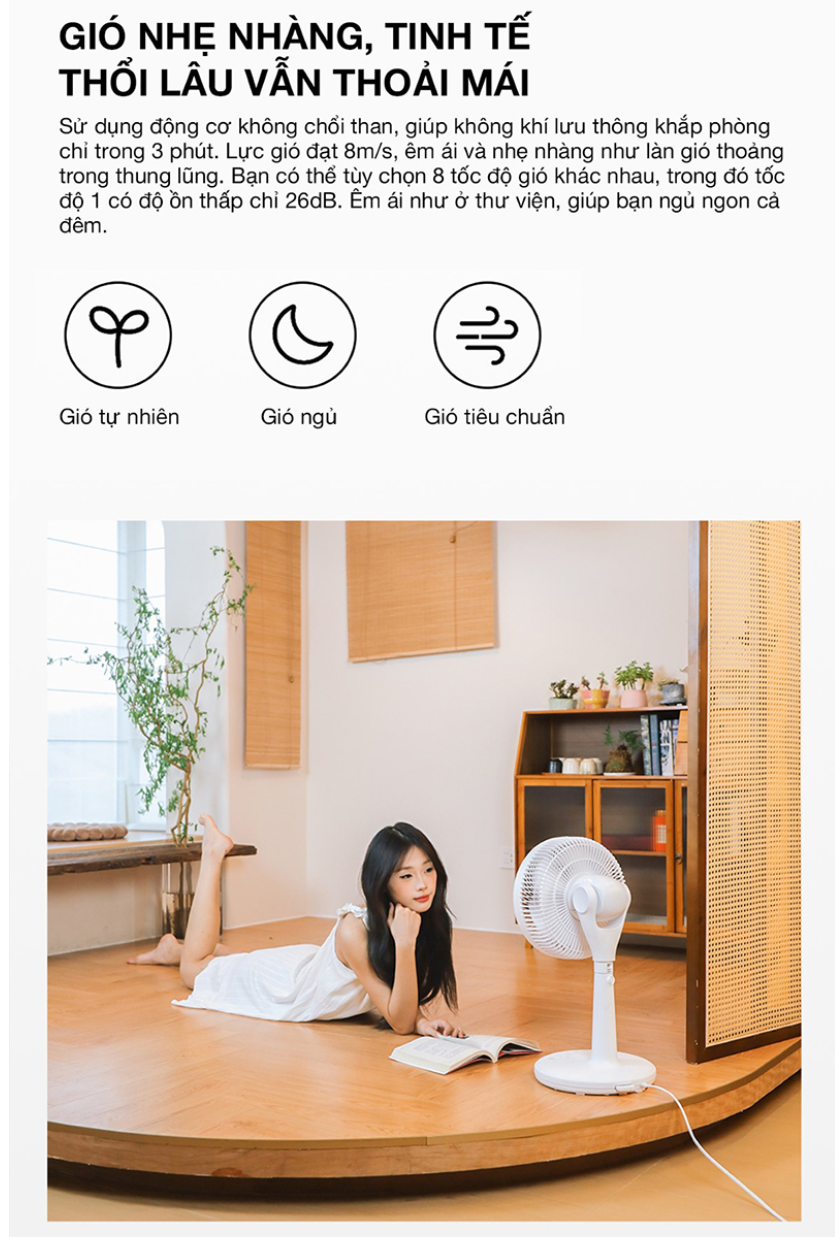 Nhờ được trang bị động cơ không chổi than, quạt điện cây Lumias F09 có khả năng lưu thông không khí khắp phòng chỉ trong vòng 3 phút với lực gió mạnh mẽ đạt 8m/s. Tuy vậy, cảm giác gió vẫn vô cùng êm ái và nhẹ nhàng, hệt như làn gió thoảng trong thung lũng, giúp bạn thoải mái ngay cả khi sử dụng trong thời gian dài. Bạn có thể tùy chọn 8 tốc độ gió khác nhau, đặc biệt, ở tốc độ 1, độ ồn chỉ vỏn vẹn 26dB – tĩnh lặng như không gian thư viện, đảm bảo bạn có giấc ngủ ngon suốt đêm.