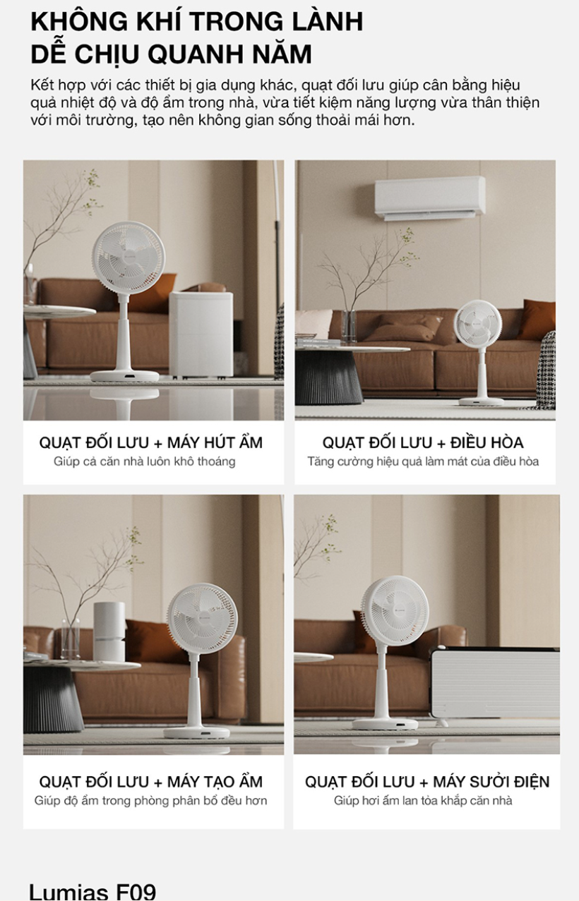Quạt đối lưu Lumias F09 không chỉ đơn thuần làm mát mà còn góp phần tạo nên một không gian sống thoải mái và trong lành quanh năm. Khi kết hợp với các thiết bị gia dụng khác, quạt đối lưu giúp cân bằng hiệu quả nhiệt độ và độ ẩm trong nhà, vừa tiết kiệm năng lượng vừa thân thiện với môi trường.