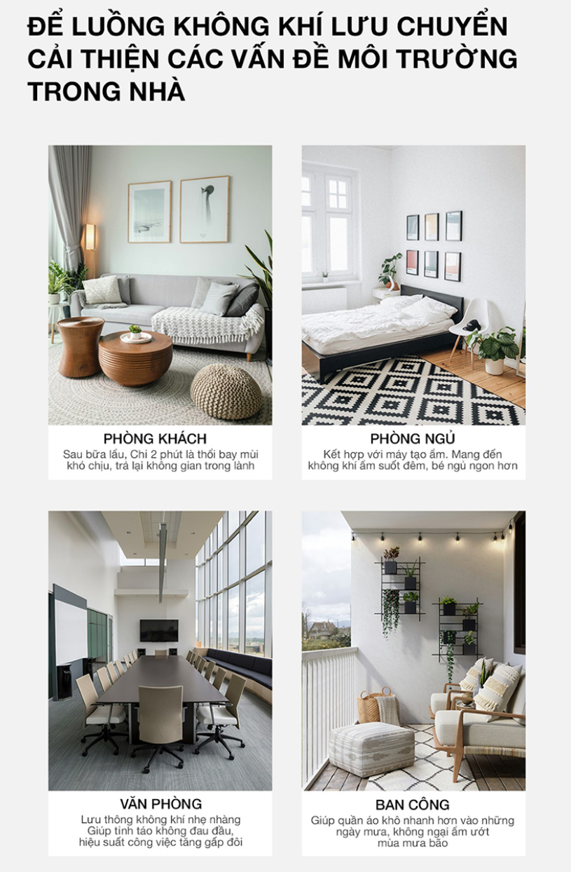 Quạt điện cây F09 còn giúp cải thiện đáng kể các vấn đề về môi trường không khí trong từng khu vực chức năng của ngôi nhà bạn: