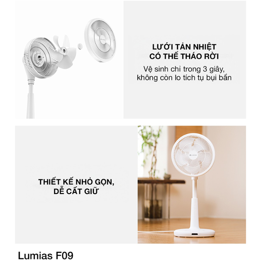 Lumias F09 sở hữu động cơ không chổi than, lực gió mạnh mẽ đạt 8m/s, êm ru thoải mái