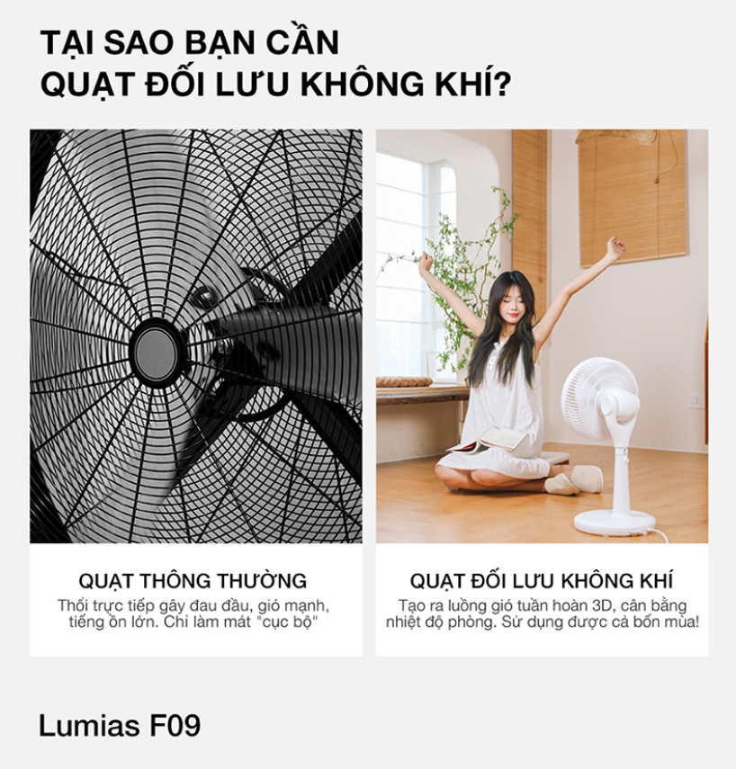 Bạn có bao giờ cảm thấy khó chịu với những chiếc quạt thông thường chỉ thổi gió mạnh trực tiếp vào người, gây đau đầu, khó chịu và ồn ào? Hơn nữa, chúng chỉ làm mát "cục bộ" trong một phạm vi hẹp. Đây chính là lý do bạn cần một quạt đối lưu không khí như Lumias F09. Khác biệt hoàn toàn, quạt đối lưu tạo này ra một luồng gió tuần hoàn 3D, giúp cân bằng nhiệt độ khắp phòng, loại bỏ cảm giác nóng cục bộ hay lạnh đột ngột. Nhờ khả năng lưu thông không khí hiệu quả, bạn có thể sử dụng quạt đối lưu linh hoạt trong cả bốn mùa, từ việc kết hợp với điều hòa vào mùa hè đến làm ấm phòng vào mùa đông.
