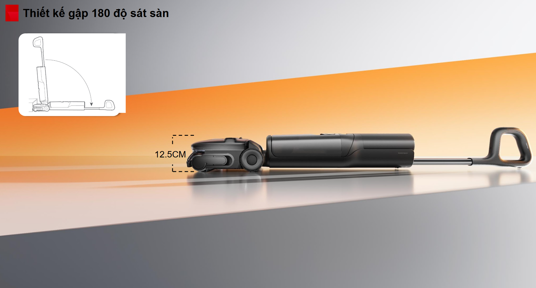 Điểm nổi bật đầu tiên của Roborock F25 Ultra chính là thiết kế gập 180 độ, cho phép người dùng dễ dàng vệ sinh các khu vực thấp như gầm ghế, gầm giường hay chân tủ mà không cần cúi người quá nhiều. Thiết kế hiện đại, tinh tế và chắc chắn giúp máy phù hợp với mọi không gian sống – từ căn hộ nhỏ cho đến nhà phố nhiều tầng.