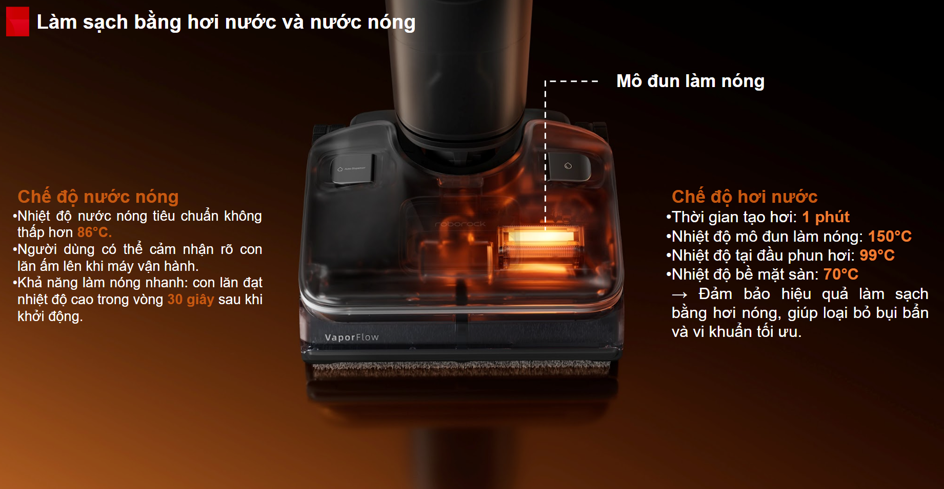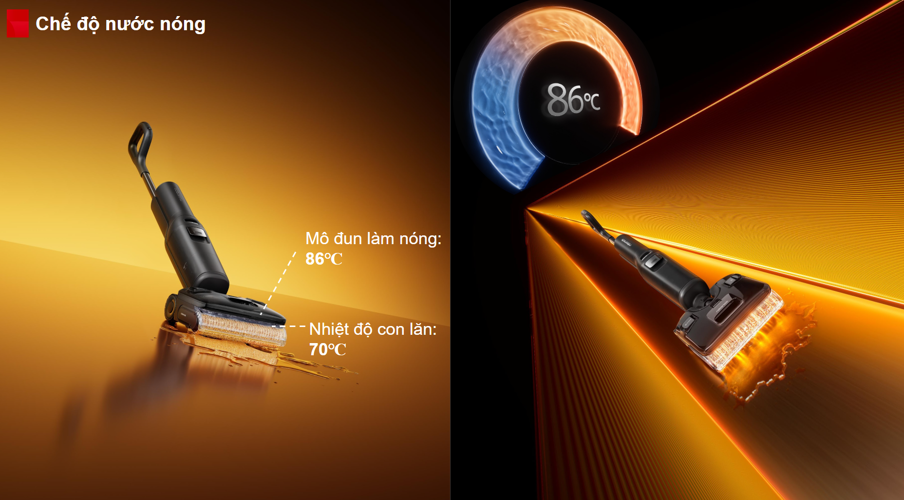 Một trong những điểm cộng lớn nhất của Roborock F25 Ultra chính là khả năng phun hơi nước 150°C và sử dụng nước nóng 86°C. Tính năng này giúp xử lý nhanh chóng những vết dầu mỡ, bùn đất, vết bẩn cứng đầu bám trên sàn nhà bếp hoặc hành lang, đồng thời tiệt trùng nhẹ nhàng, đảm bảo an toàn vệ sinh cho trẻ nhỏ và thú cưng.