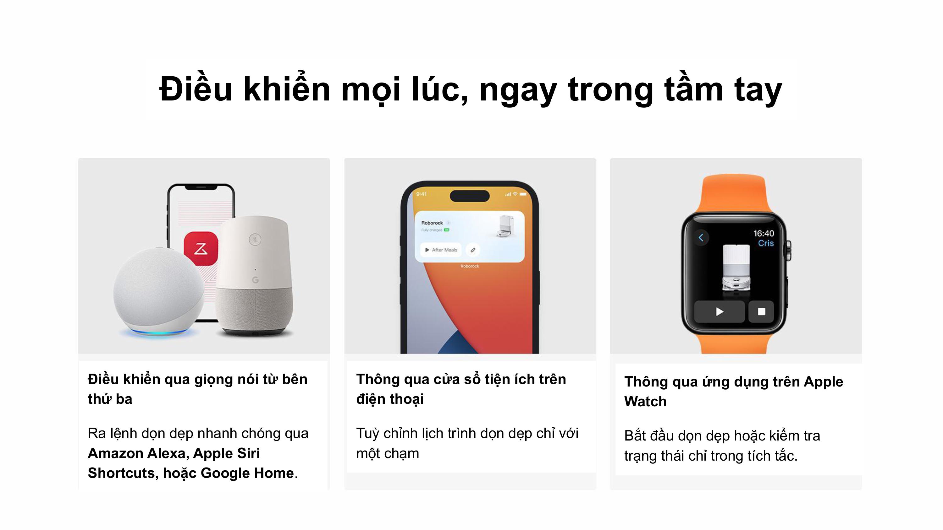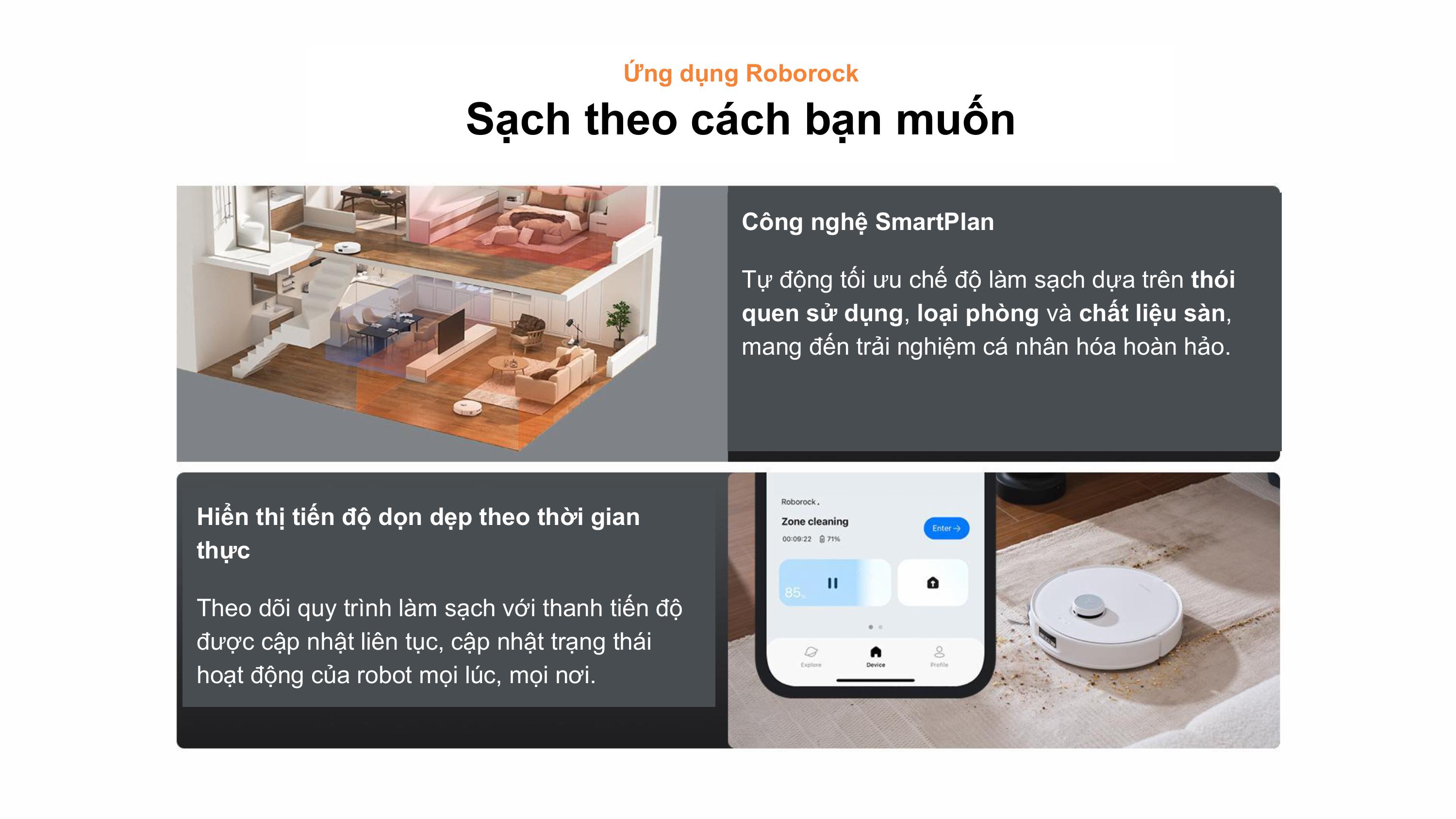 Robot tương thích với ứng dụng Roborock, hỗ trợ giọng nói bên thứ 3, cá nhân hóa từng tác vụ làm sạch.