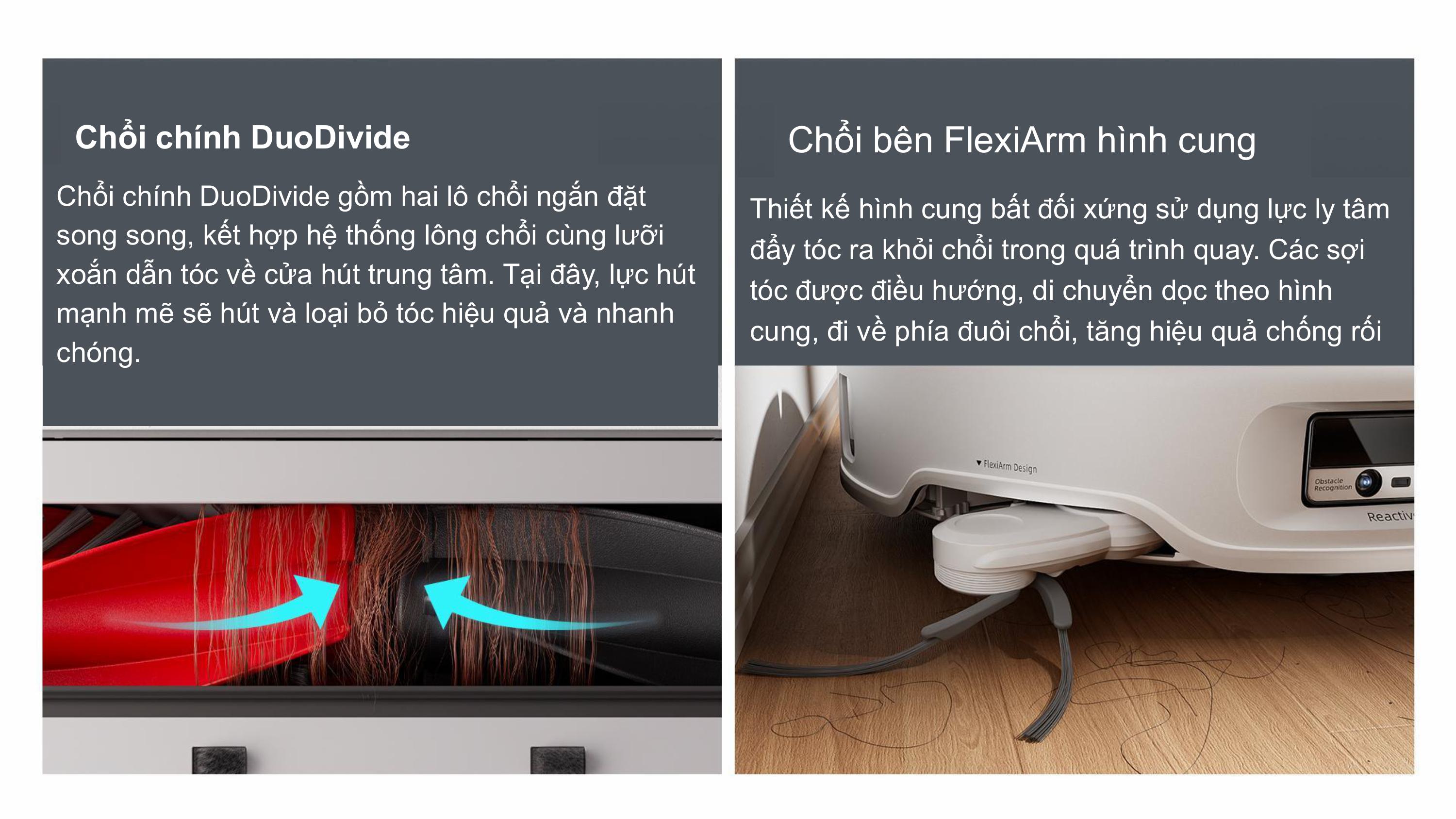 Roborock Q Edge 5V1 Model 2025 được trang bị chổi chính DuoDivide kết hợp chổi bên FlexiArm Arc, giúp loại bỏ hoàn toàn tình trạng rối tóc, lông thú cưng khi làm sạch.