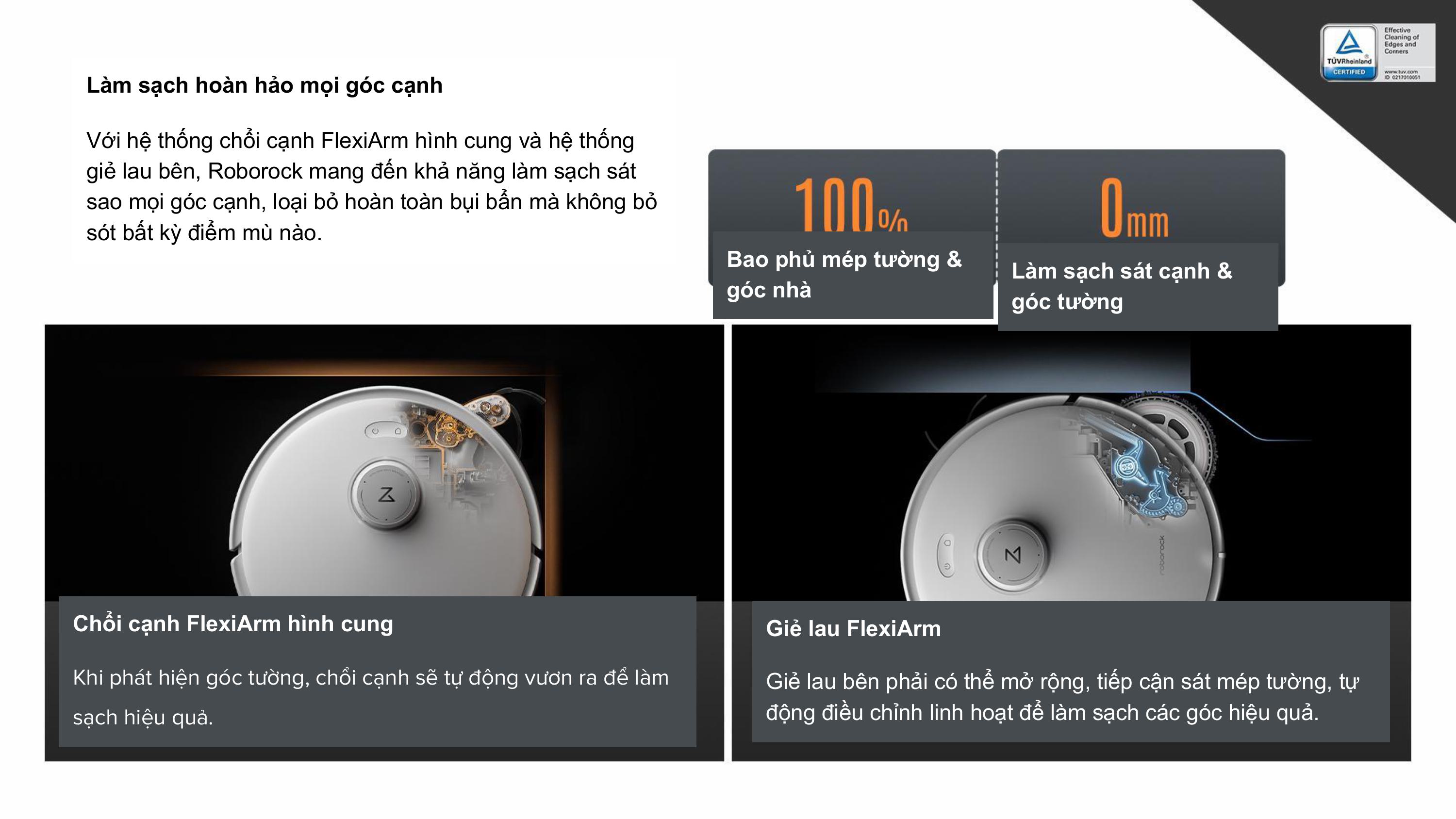 Roborock Q Edge 5V1 sử dụng chổi bên và cây lau nhà FlexiArm, có khả năng mở rộng, tiếp cận tối đa vào các góc khuất, tạo độ sạch sẽ tuyệt đối.