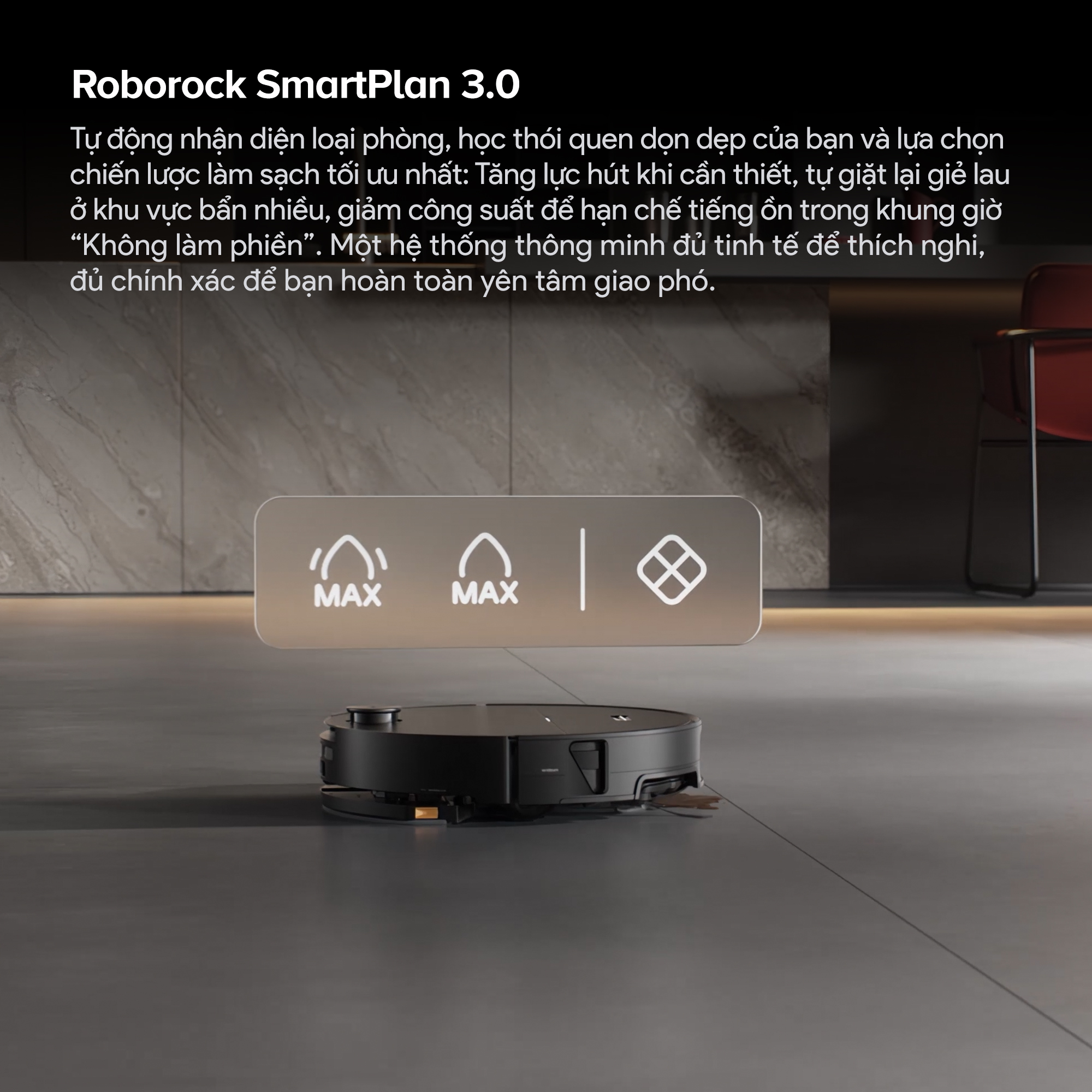 - Được điều chỉnh trực tiếp qua ứng dụng Roborock cho phù hợp từng loại sàn.