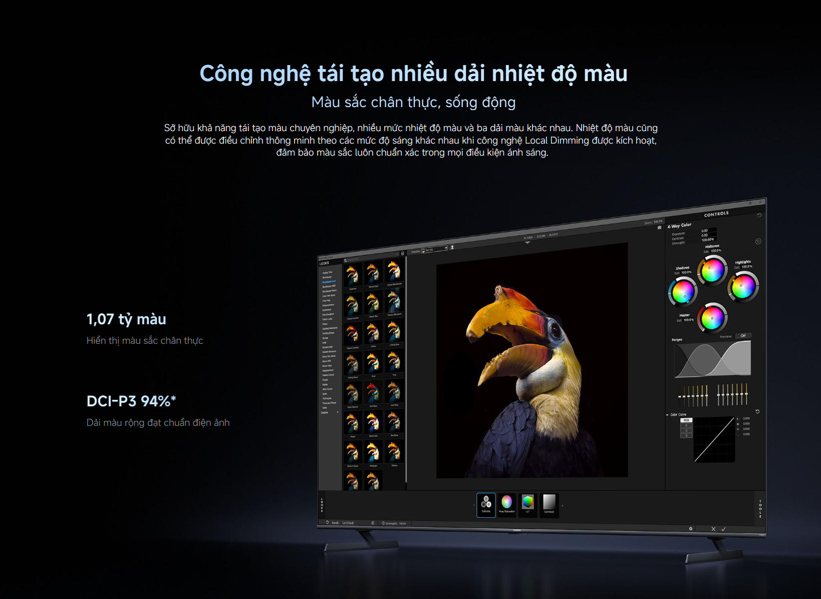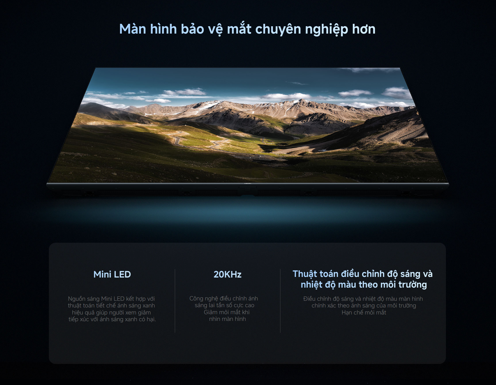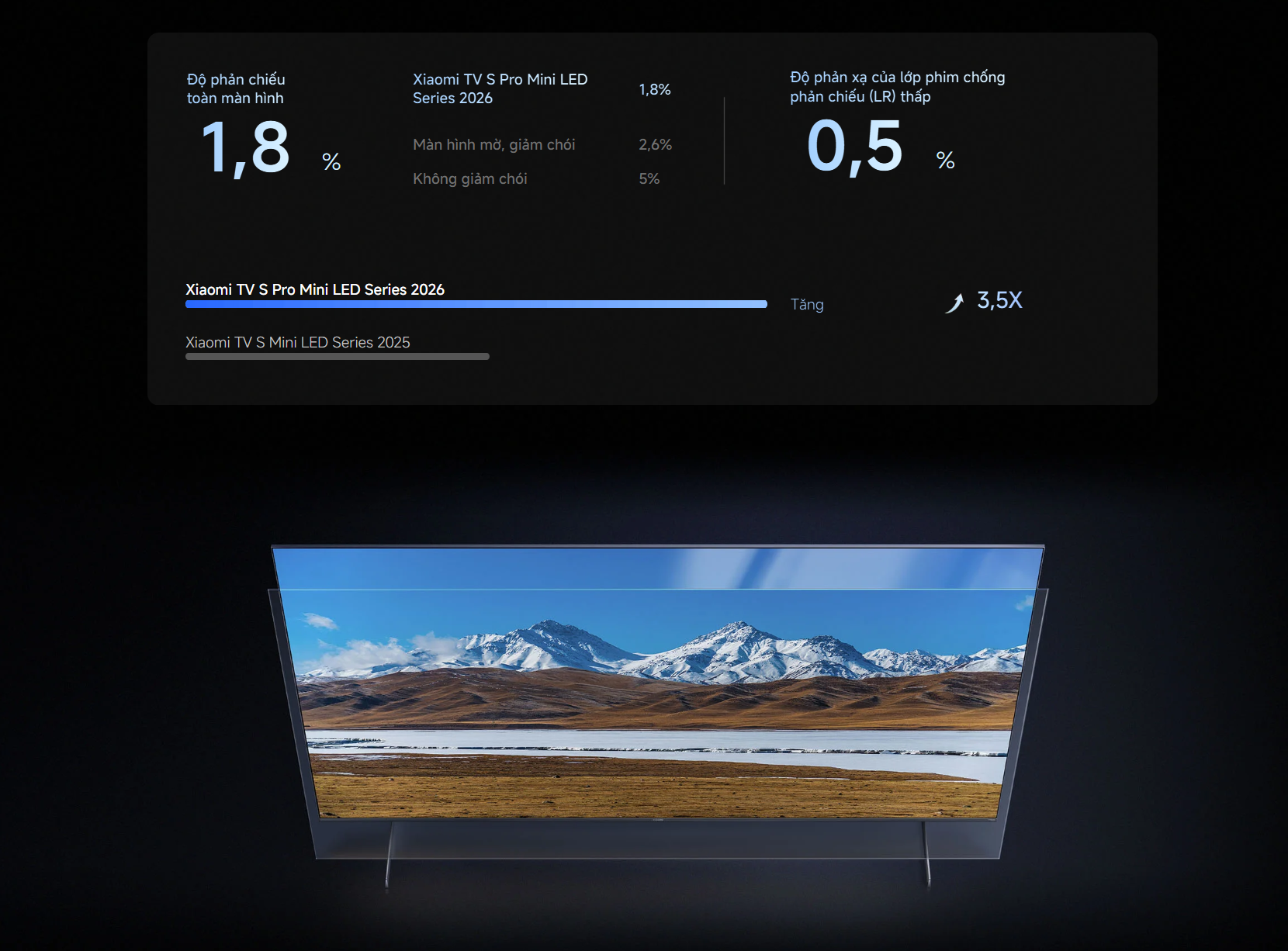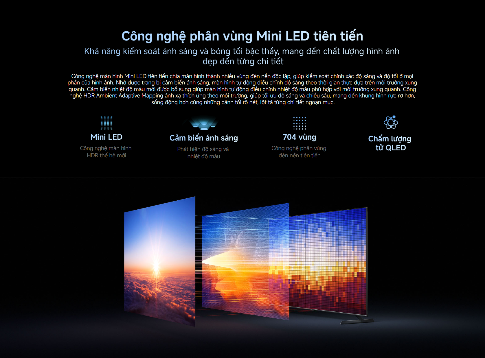 - Công nghệ QD-MiniLED hiển thị màu sắc chính xác, độ sáng cao và khả năng chống phản chiếu vượt trội.