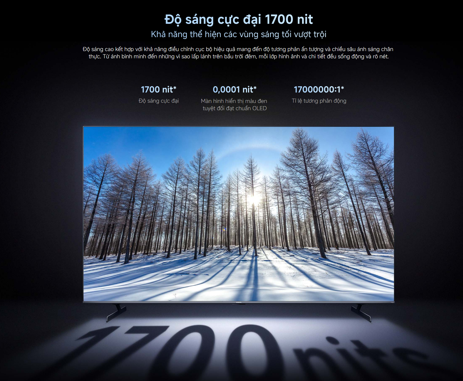 - Độ sáng tối đa 1700 nits, mang lại hình ảnh rõ ràng ngay cả trong môi trường nhiều ánh sáng.