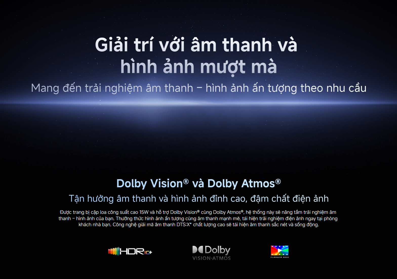 - Hỗ trợ chuẩn âm thanh Dolby Audio, Dolby Atmos®, DTS-X, mang đến trải nghiệm âm thanh vòm lan tỏa khắp không gian.