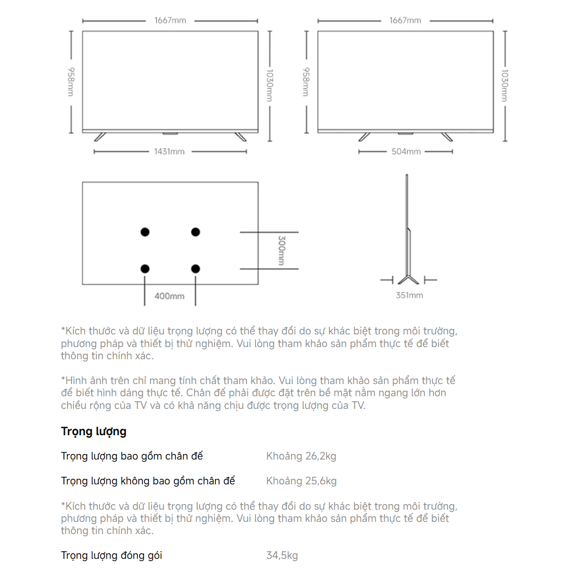 - Kích thước (có chân): 1667 x 351 x 1030 mm.