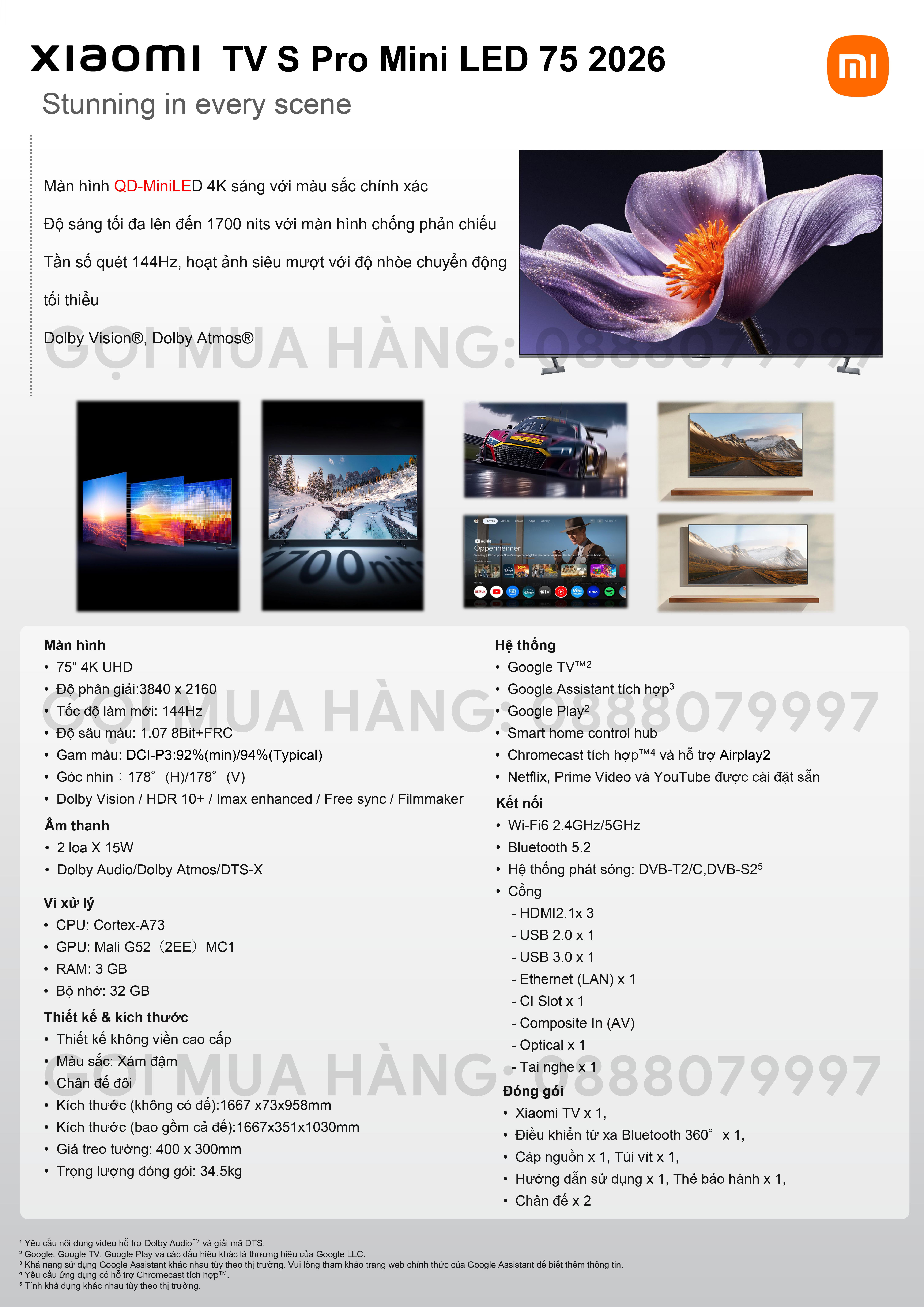 • Màn hình lớn 75 inch, chuẩn QD-MiniLED 4K siêu sáng.