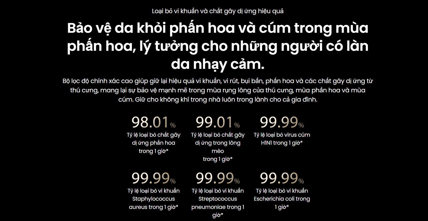 Loại bỏ đến 98,02% phấn hoa và 99,01% lông mèo