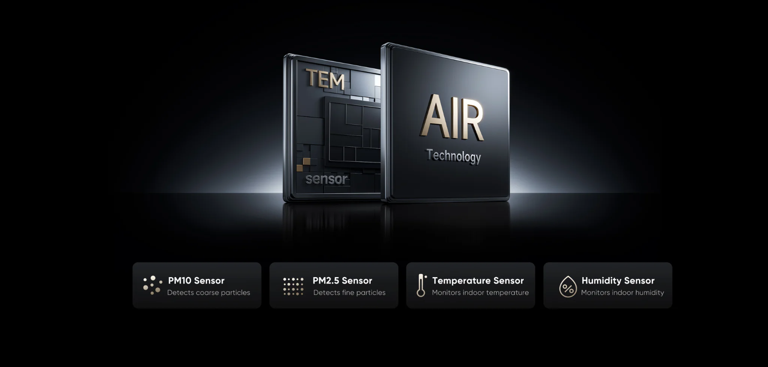 Máy được trang bị cảm biến kép PM2.5 và PM10, cho khả năng phát hiện chính xác các chất ô nhiễm trong không khí như: