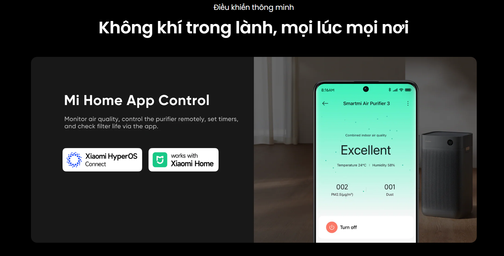 Smartmi 3 hỗ trợ điều khiển thông minh qua ứng dụng Mi Home, cho phép: