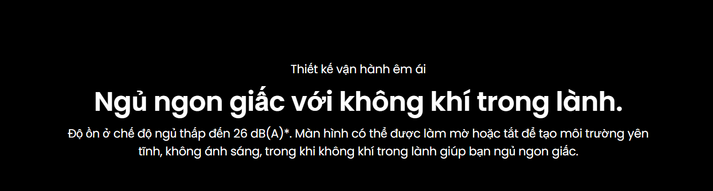 Ở chế độ ngủ, máy hoạt động với độ ồn chỉ 26 dB(A), gần như không gây ảnh hưởng đến giấc ngủ. Màn hình LED có thể làm mờ hoặc tắt hoàn toàn, tạo môi trường yên tĩnh và dễ chịu.