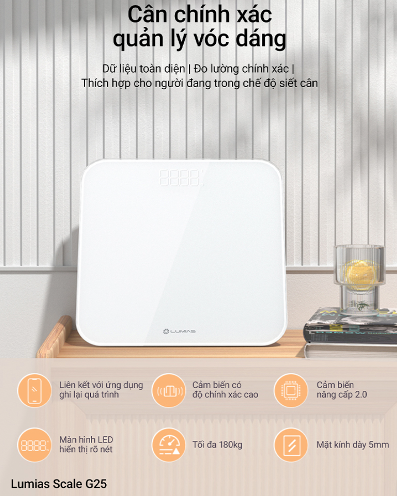 Cân điện tử Lumias Scale G25 có màn hình LED ẩn cao cấp hiển thị rõ ràng các chỉ số đo lường, sử dụng 3 viên pin AAA 1.5V, dễ dàng thay thế khi cần thiết. Công nghệ Step-On cho phép cân tự động bật khi bạn bước lên, tự động tắt sau 30 giây không sử dụng. Cảm biến tiên tiến 2.0 có độ chính xác cao, đo lường sự thay đổi trọng lượng tối thiểu 0.05kg. Đặc biệt, Lumias Scale G25 kết nối với ứng dụng MiHome qua Bluetooth, cho phép đồng bộ hóa dữ liệu, theo dõi lịch sử đo lường và các chỉ số sức khỏe khác.