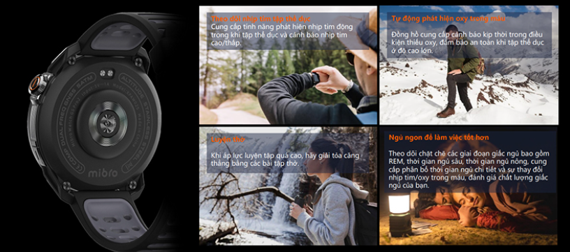 GS Pro2 là người bạn đồng hành tận tâm, liên tục theo dõi nhịp tim 24 giờ và đưa ra cảnh báo kịp thời khi nhịp tim quá cao hoặc quá thấp trong lúc tập luyện, giúp bạn kiểm soát cường độ hiệu quả. Nó có khả năng tự động phát hiện nồng độ oxy trong máu, cảnh báo quan trọng trong điều kiện thiếu oxy, đảm bảo an toàn khi bạn vận động ở những độ cao lớn hay tập luyện cường độ cao. Khi cảm thấy áp lực hay căng thẳng sau những buổi tập nặng, tính năng luyện thở sẽ giúp bạn thư giãn, phục hồi.