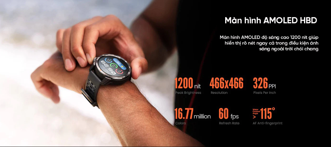 Chiếc đồng hồ thông minh Mibro GS Pro 2 sở hữu màn hình AMOLED 1.43 inch với độ phân giải cao 466x466 pixel, mang lại mật độ điểm ảnh 326 ppi sắc nét đến từng chi tiết. Đặc biệt, màn hình có độ sáng tối đa lên tới 1200 nits, cho khả năng hiển thị tuyệt vời ngay cả dưới ánh nắng mặt trời gay gắt hay trong điều kiện ánh sáng mạnh.