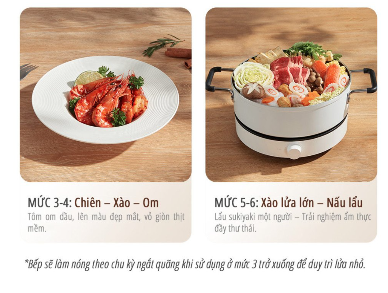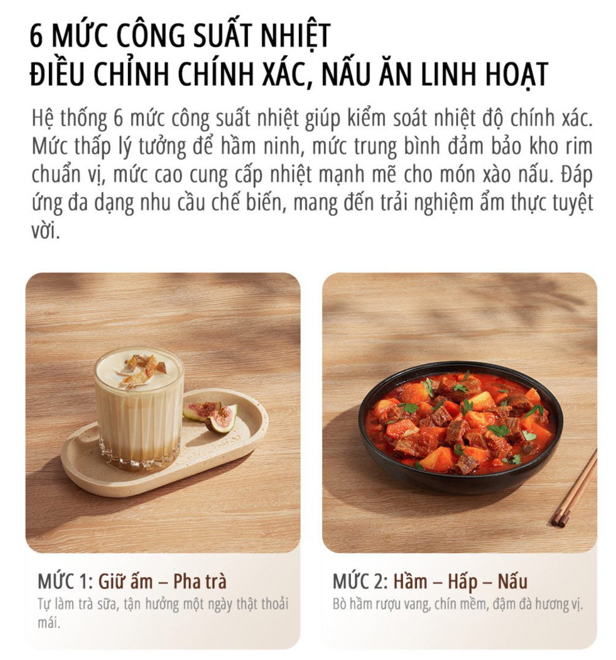 Có 6 mức tùy chỉnh nhiệt để người dùng có thể tùy chỉnh theo món ăn của mình. Như chế độ nhiệt thấp có thể dùng trong các món cần đun sôi nhẹ, mức nhiệt trung bình để đun sôi đều và mức nhiệt cao để xào, nấu,...Từ đó, với 6 mức nhiệt được cài đặt sẵn bạn có thể điều chỉnh tùy theo nhu cầu của mình một cách dễ dàng.