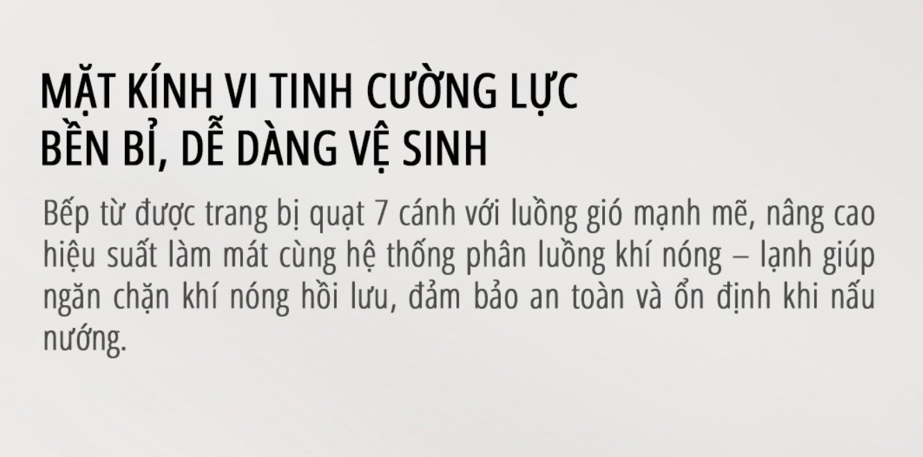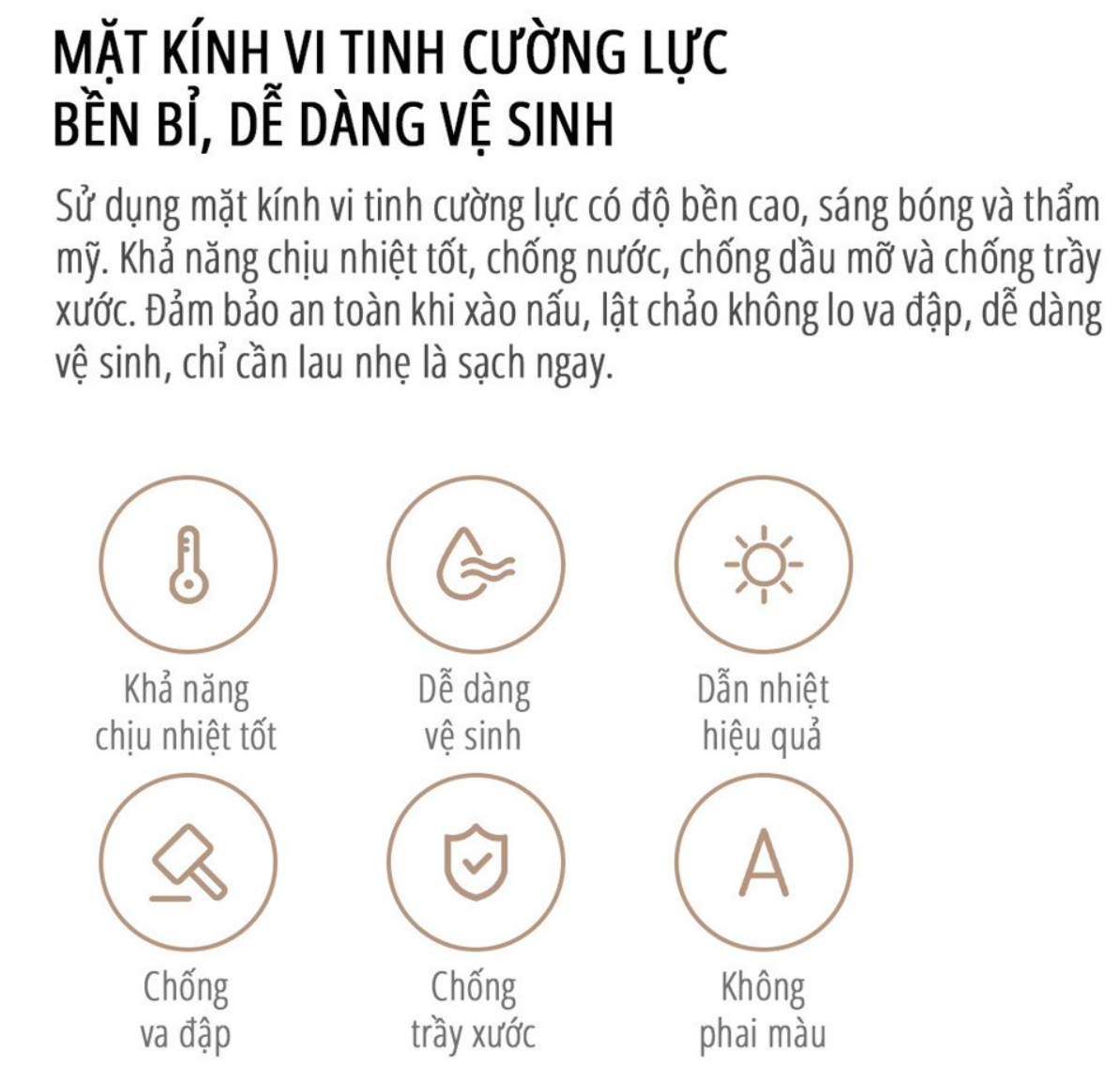 Bếp sử dụng bảng điều khiển vi tinh thể bền bỉ, sáng đẹp, chịu nhiệt độ cao, không thấm nước, chống dầu, trầy xước và mài mòn. Chống va đập khi xào, chiên, dễ bảo quản và làm sạch chỉ với một lần lau.