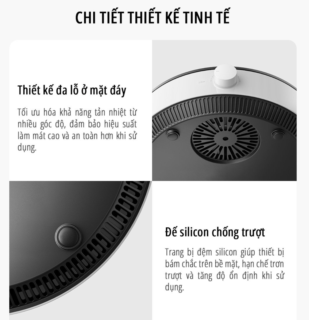 Bếp từ N1 có hệ thống tản nhiệt hiệu quả với quạt hướng trục 7 cánh, giúp làm mát nhanh chóng. Thiết kế này ngăn không cho khí nóng chảy ngược, đảm bảo an toàn và giữ cho không gian nấu ăn luôn thoáng mát. Nhờ đó, bạn có thể thưởng thức những bữa ăn ngon mà không bị gián đoạn hay ảnh hưởng bởi nhiệt độ cao. Hệ thống tản nhiệt là một tính năng quan trọng, góp phần mang lại trải nghiệm nấu nướng thoải mái và an toàn.