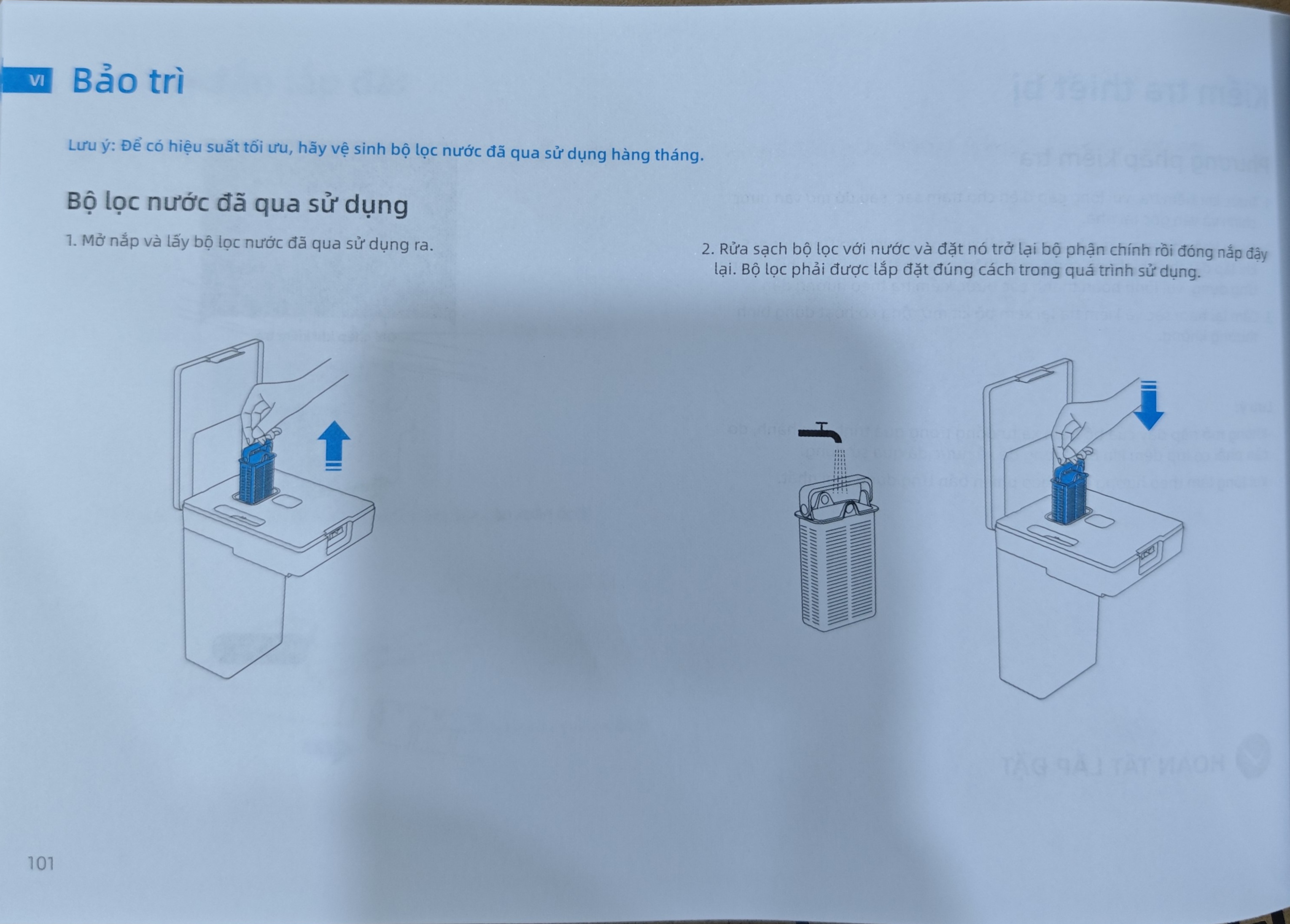 Bảo trì Lưu ý: Để có hiệu suất tối ưu, hãy vệ sinh bộ lọc nước đã qua sử dụng hàng tháng.