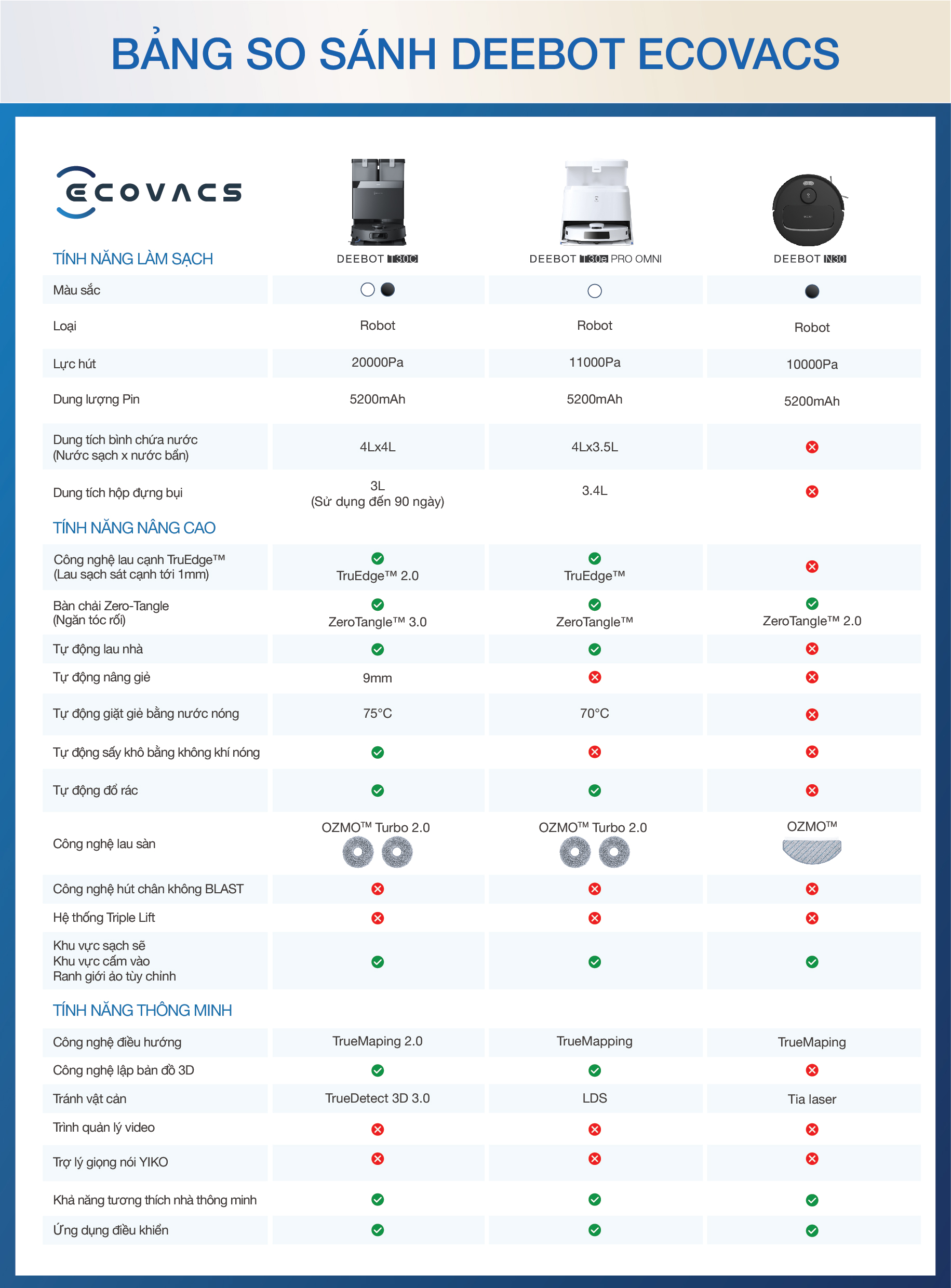 - Ưu Điểm Chung: Tất cả mẫu đều hybrid (hút + lau), app thân thiện, và cập nhật phần mềm thường xuyên. Ecovacs nổi bật với dock Omni tự bảo dưỡng, giảm công việc thủ công.