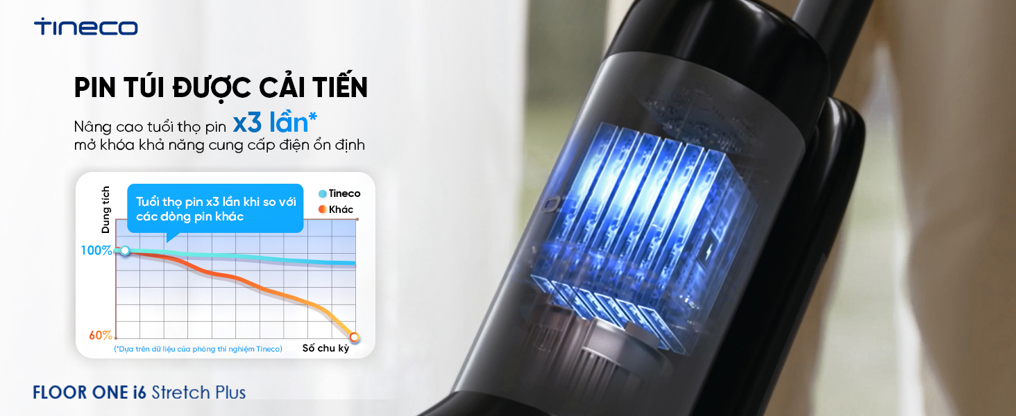 Tineco i6 Stretch Plus nổi bật với công suất mạnh hơn, pin dung lượng cao hơn, thời gian hoạt động lâu hơn và có tính năng sấy khô 85°C.