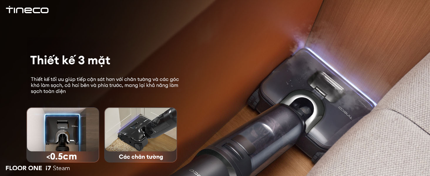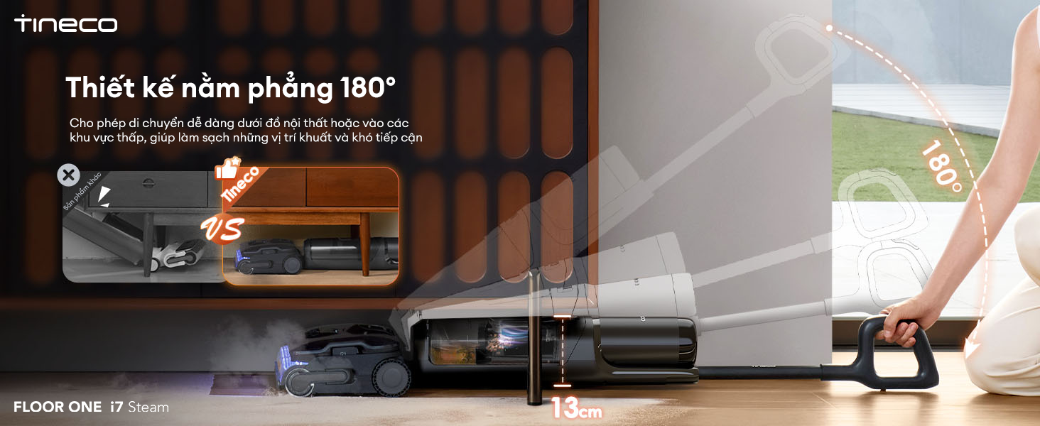 Với khả năng gập phẳng 180°, máy hút bụi Tineco i7 Steam dễ dàng tiếp cận các khu vực thấp như gầm giường, sofa mà không cần cúi người, trong khi đầu hút tràn viền giúp làm sạch sát mép tường, loại bỏ bụi bẩn ở những vị trí khó tiếp cận. Kết hợp với khả năng xoay linh hoạt và phân bổ trọng lượng thông minh, tạo cảm giác nhẹ tay khi di chuyển, hạn chế mỏi cổ tay khi sử dụng lâu.