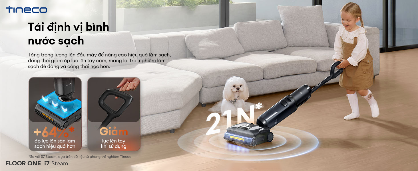 • Tái định vị bình nước sạch lên phía trên chổi lăn. tăng áp lực lên sàn thêm 64% (đạt mức 21N) để đánh bay vết bẩn hiệu quả hơn mà còn giúp giảm đáng kể trọng lượng đè lên tay cầm, người cao tuổi hay trẻ em cũng có thể sử dụng dễ dàng.