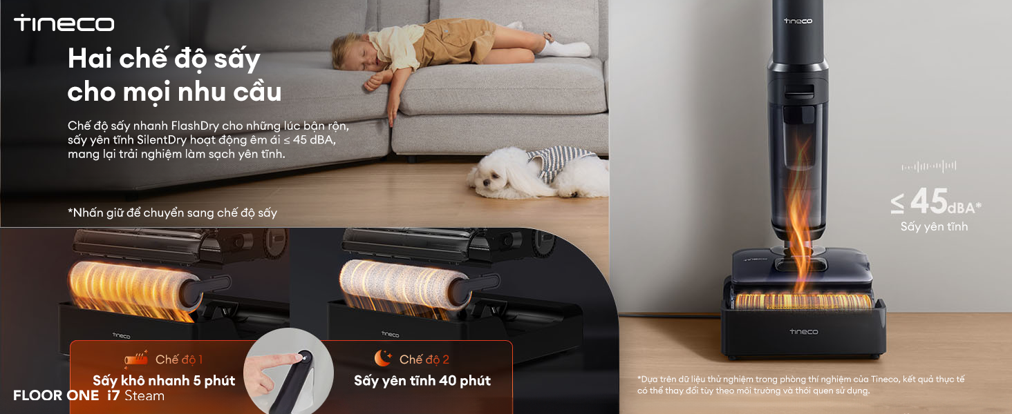 Lưu ý: Kết quả thực tế về thời gian và độ ồn có thể thay đổi nhẹ tùy theo điều kiện môi trường và thói quen sử dụng (Dựa trên dữ liệu thử nghiệm tại phòng thí nghiệm Tineco).