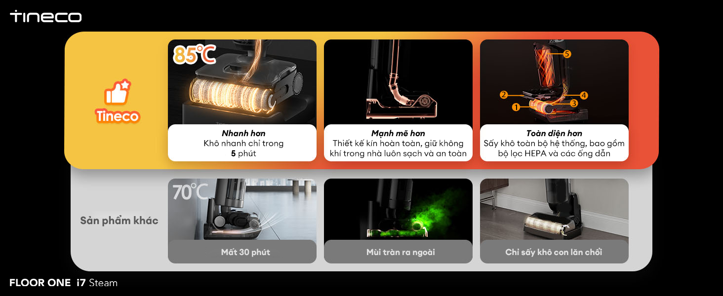 Tineco FLOOR ONE i7 Steam với công nghệ HyperSteam 160°C làm sạch sâu. diệt khuẩn hiệu quả