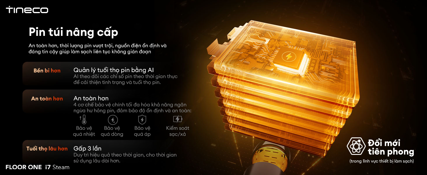 • An toàn tuyệt đối với 4 cơ chế bảo vệ: Tineco đặc biệt chú trọng đến sự an toàn khi trang bị 4 lớp bảo vệ nghiêm ngặt, bao gồm: Bảo vệ quá nhiệt, Bảo vệ quá dòng, Bảo vệ quá áp và Kiểm soát sạc/xả. Hệ thống này giúp ngăn ngừa tối đa nguy cơ hư hỏng, cháy nổ, mang lại sự an tâm tuyệt đối trong suốt quá trình sử dụng.