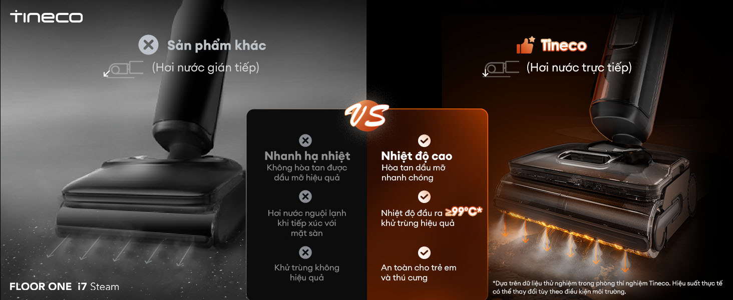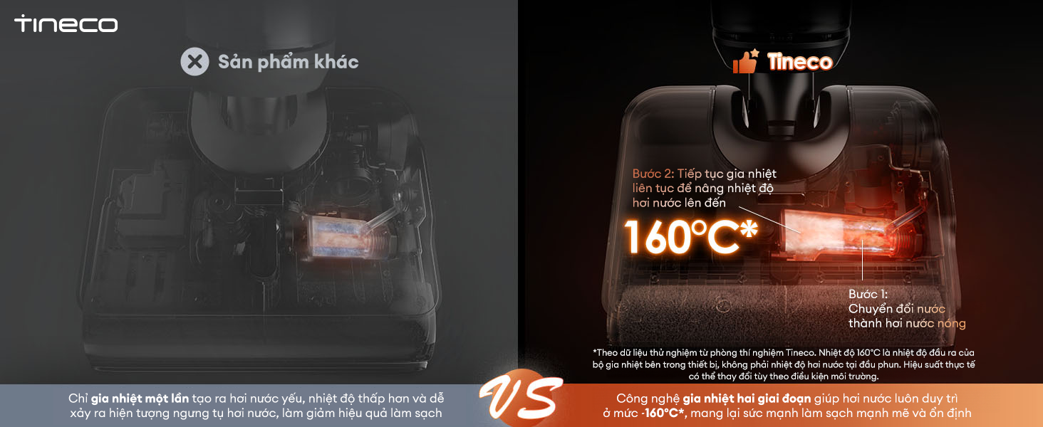 Dữ liệu thử nghiệm từ phòng thí nghiệm Tineco. Nhiệt độ 160°C là nhiệt độ đầu ra của bộ gia nhiệt bên trong thiết bị, không phải nhiệt độ hơi nước tại đầu phun.