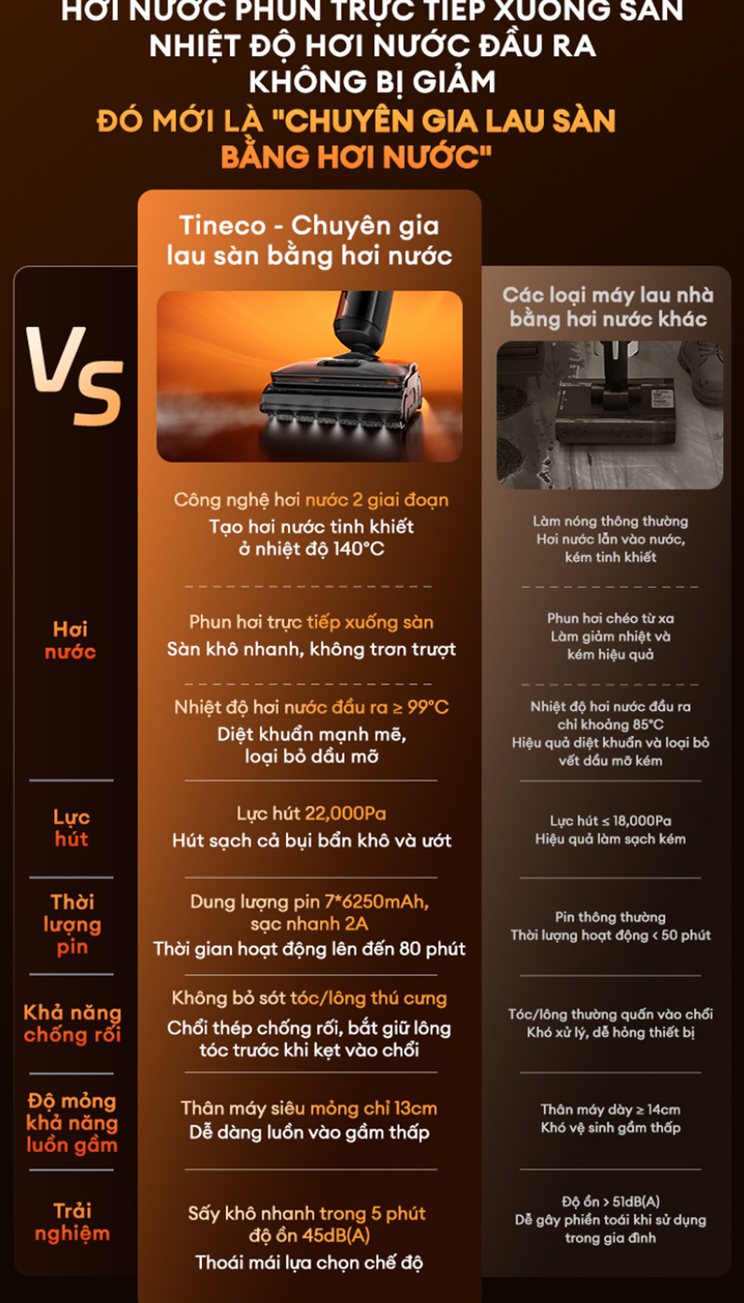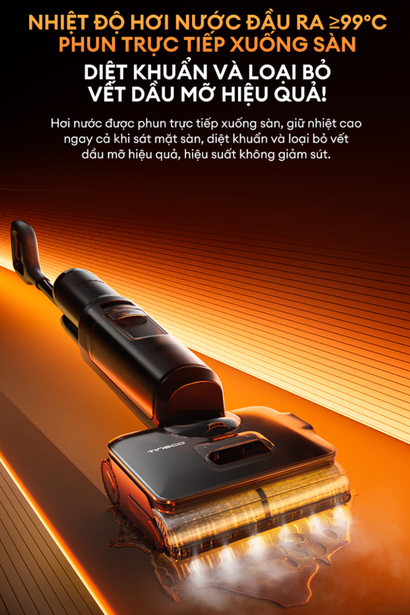 So với nhiều sản phẩm khác bị giảm nhiệt khi hơi nước tiếp xúc sàn, Tineco vẫn giữ được sức nóng mạnh mẽ, giúp vệ sinh nhanh chóng và an toàn tuyệt đối.
