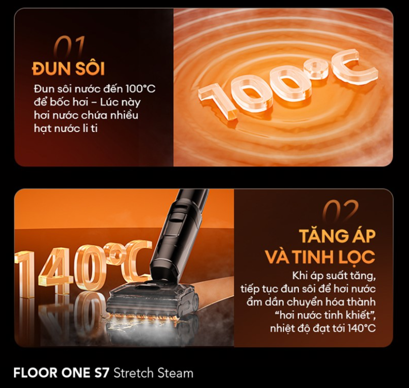 Điểm nổi bật nhất của Tineco S7 Stretch Steam chính là công nghệ làm sạch bằng hơi nước HyperSteam 140℃.