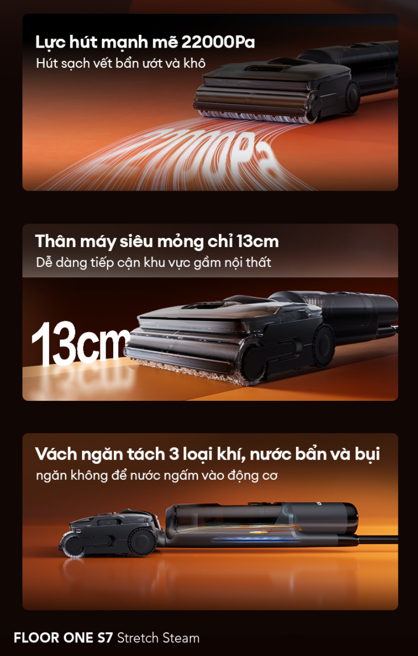 Sở hữu lực hút mạnh mẽ lên tới 22.000Pa, vượt trội hơn 22% so với thế hệ trước, Tineco S7 Stretch Steam có thể: